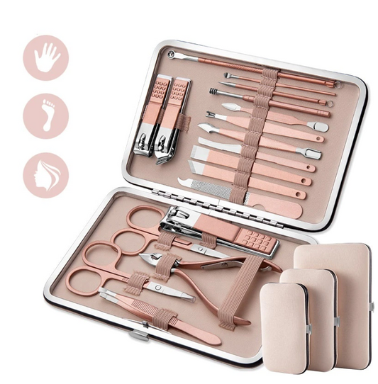 1+1 CADOU: Trusa COMPLETA Mani-Pedi de 18 piese din OTEL Inoxidabil si Accesorii Pentru Ingrijire Faciala incluse in Geanta de Depozitare
