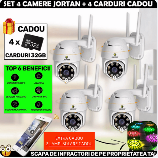 SET 4 X Camera Smart Color Jortan Surveillance4® Wifi, IP Vizualizare Live Prin Aplicatie, Senzor de Miscare + 4 CARDURI CADOU+ 2 x Lampi Solare CADOU CW4.4
