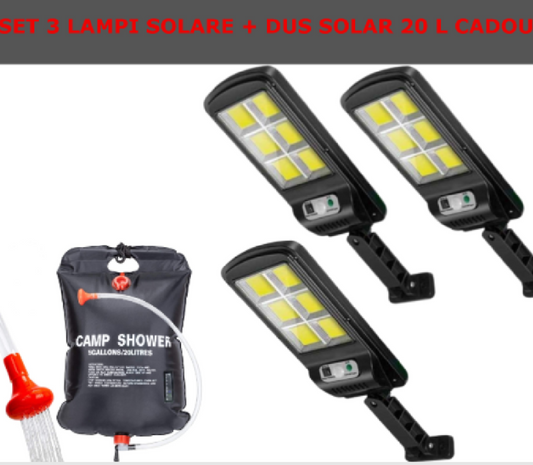 Set De 3 Lampi Solare, Cu Senzor De Miscare SI Telecomanda, 300W + CADOU Dus Solar 20 Litri