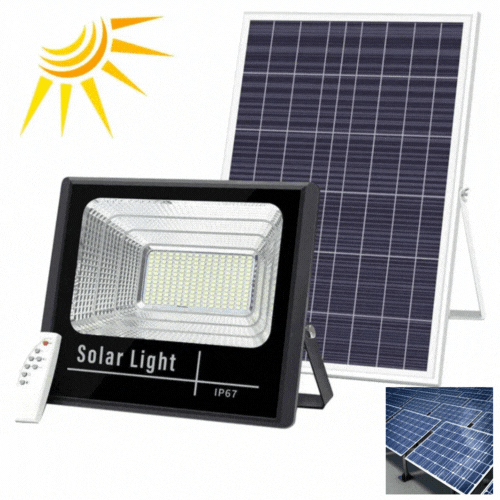 2+2 GRATIS - Proiector LED cu Panou Solar VELORA, 50W, Control Prin Telecomanda, Senzor Crepuscular + Accesorii+ Lampa Solara 100x Led CADOU