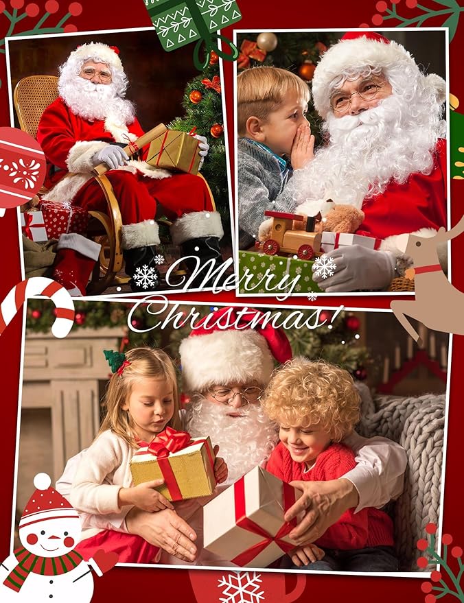 Costumul include pantaloni si sacou in nuante vibrante de alb si rosu, culorile traditionale ale Mosului, care evoca bucuria si caldura Craciunului. Centura lata adauga un accent distinctiv, in timp ce caciula moale si pufoasa iti confera un aer jucaus si plin de viata.
