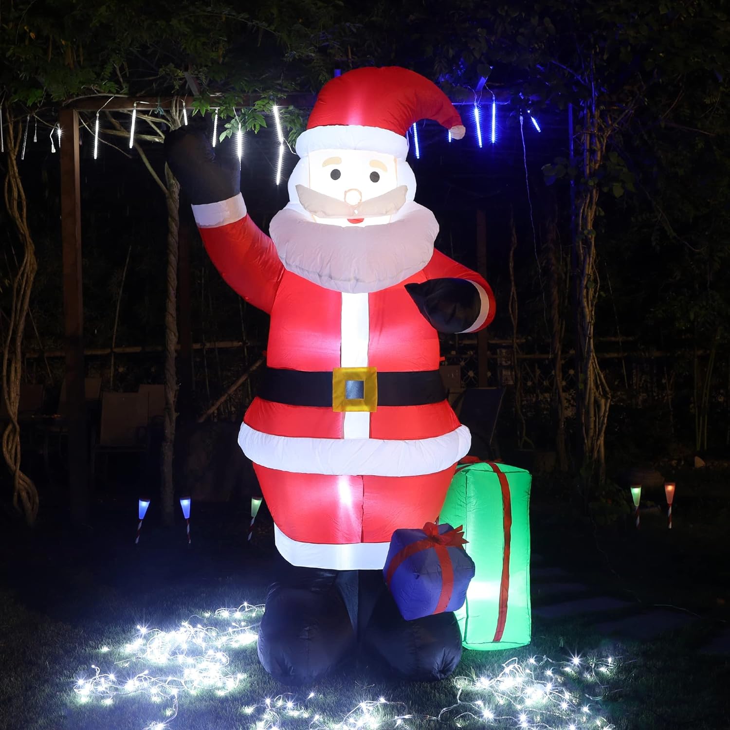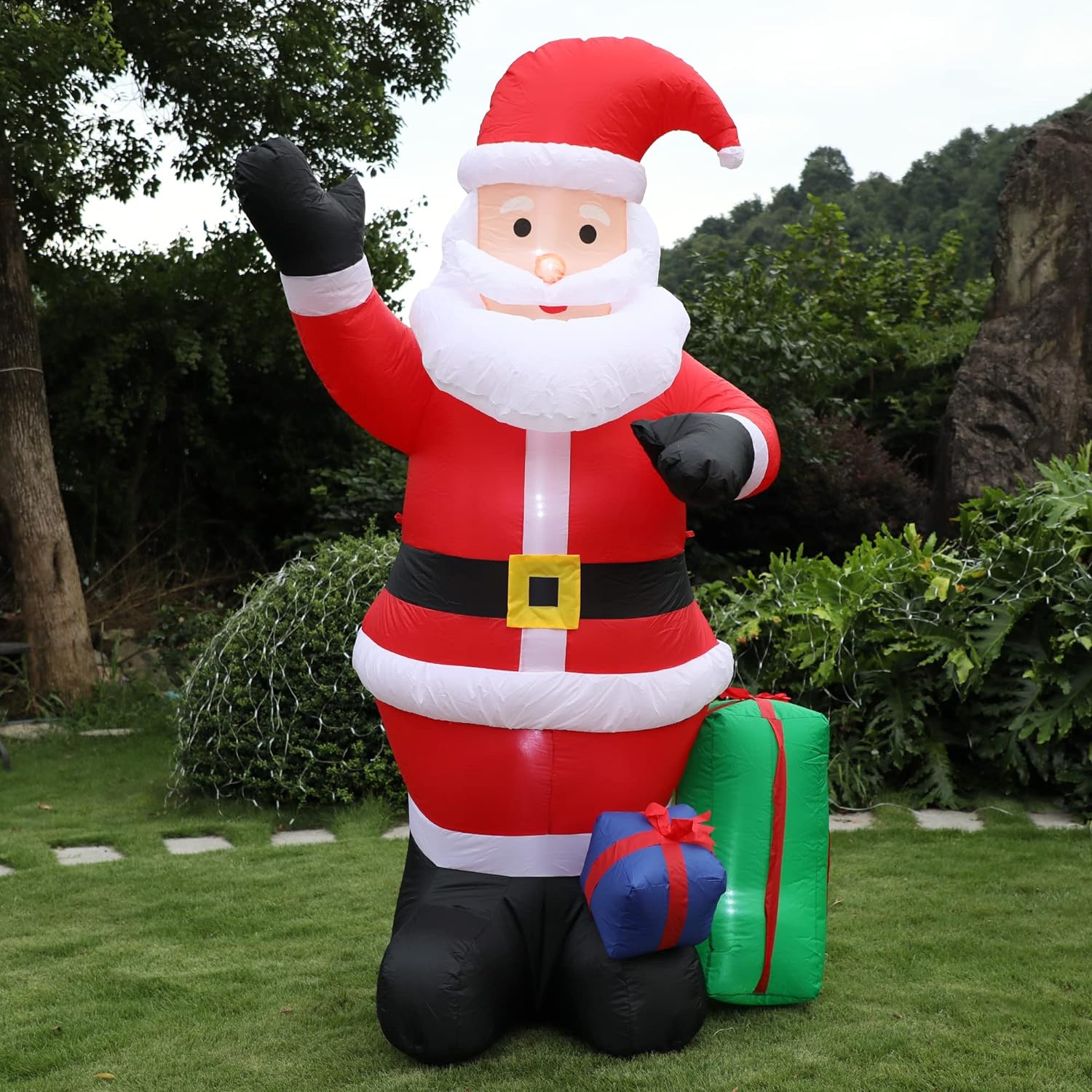 Fabricat din țesătură de poliester, acest Moș Crăciun este de greutate redusă și rezistent la intemperii. Este ușor și rapid de configurat: doar conectați-l cu adaptorul inclus și decorațiunea dvs. se va umfla complet, în câteva minute. Frânghia și țărușii de sol sunt incluși pentru o fixare suplimentară. Când nu îl folosiți, îl puteți dezumfla, pentru a fi ușor de depozitat. În plus, becurile LED din interior creează un element de decor strălucitor, pe timp de noapte. Este o decorațiune perfectă pentru ușa din față sau curtea din spatele casei.