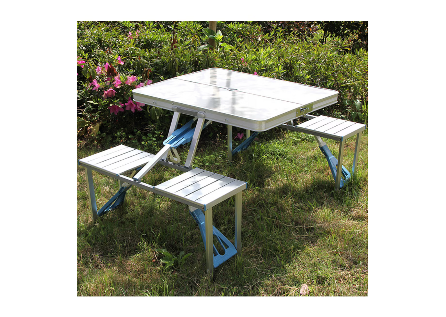 Masa pentru picnic pliabila din aluminiu cu 4 scaune - o solutie ideala si completa pentru camping sau o calatorie in aer liber. Ocupa putin spatiu atunci cand este pliat, ceea ce il face usor de transportat si depozitat.